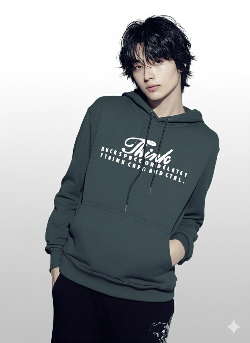 Unique Dual-Side Print: The front features the elegant cursive word “Think,” thoughtfully paired with the relatable, witty question, “BACKSPACE OR DELETE?”. Turn around, and the hoodie makes a bold impact with a large, distressed “CAPS LOCK” graphic on the back.